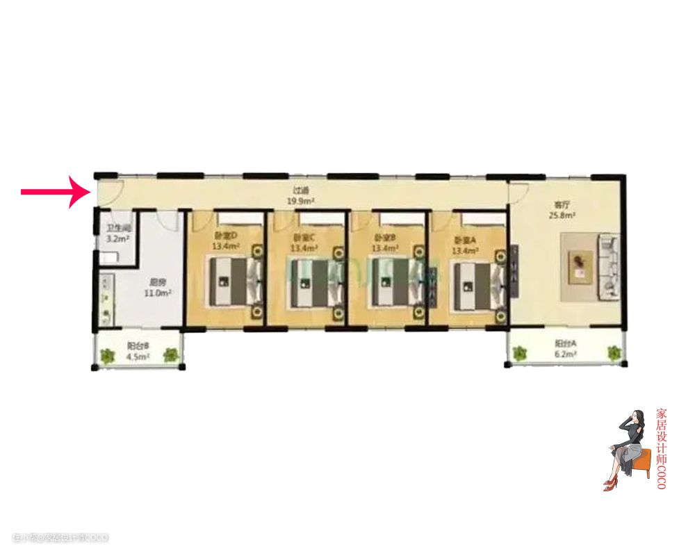 最后,这类户型还有个缺点,就是入户直冲一个卧室,稍微不注意的房子就会造成门冲门的格局,这是很多人比较忌讳的,当然,这个门的位置基本可以改动。