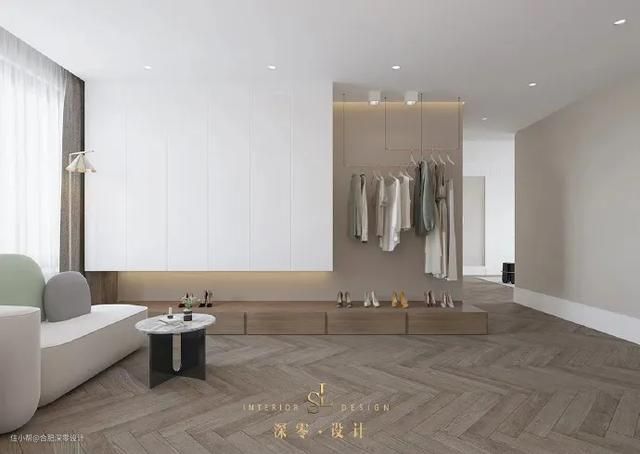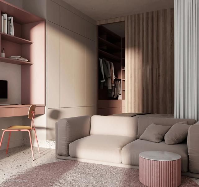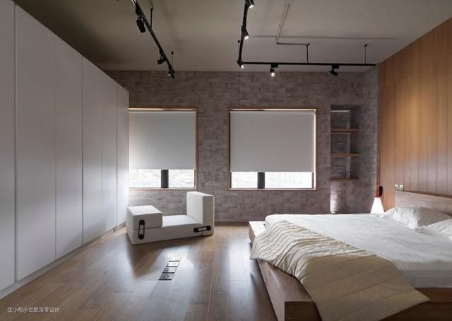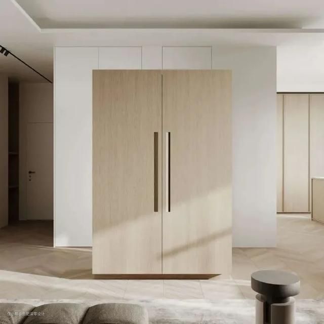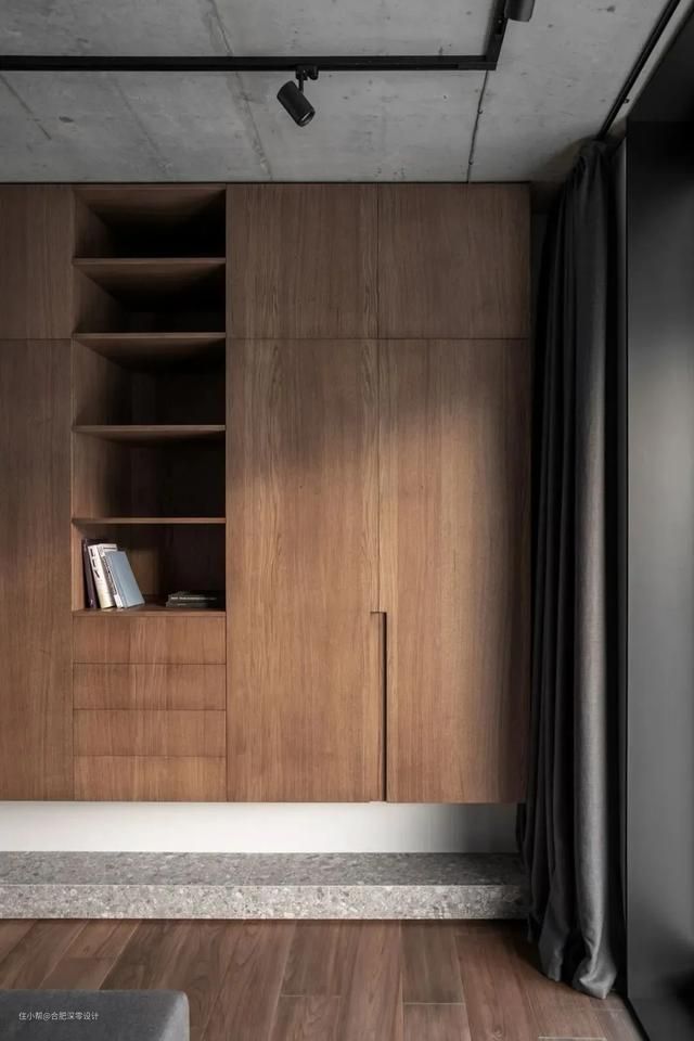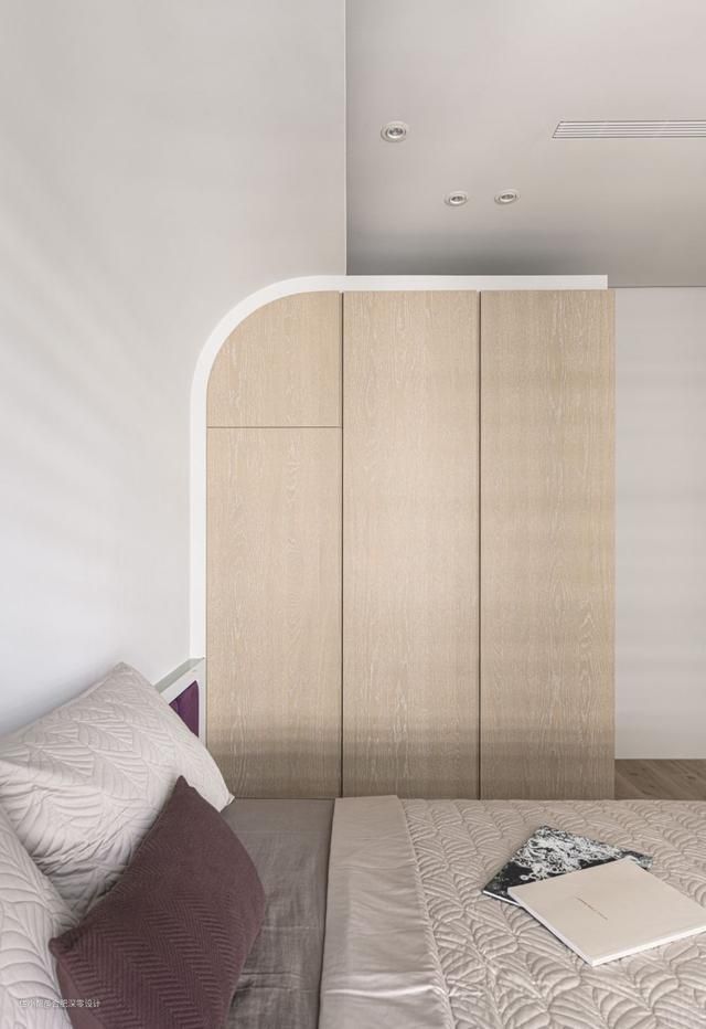 这个空间相对来说就比较自由了,一般都是顶天立地的大衣柜,无把手设计更能增加整体的空间感,保持卧室的一致性。