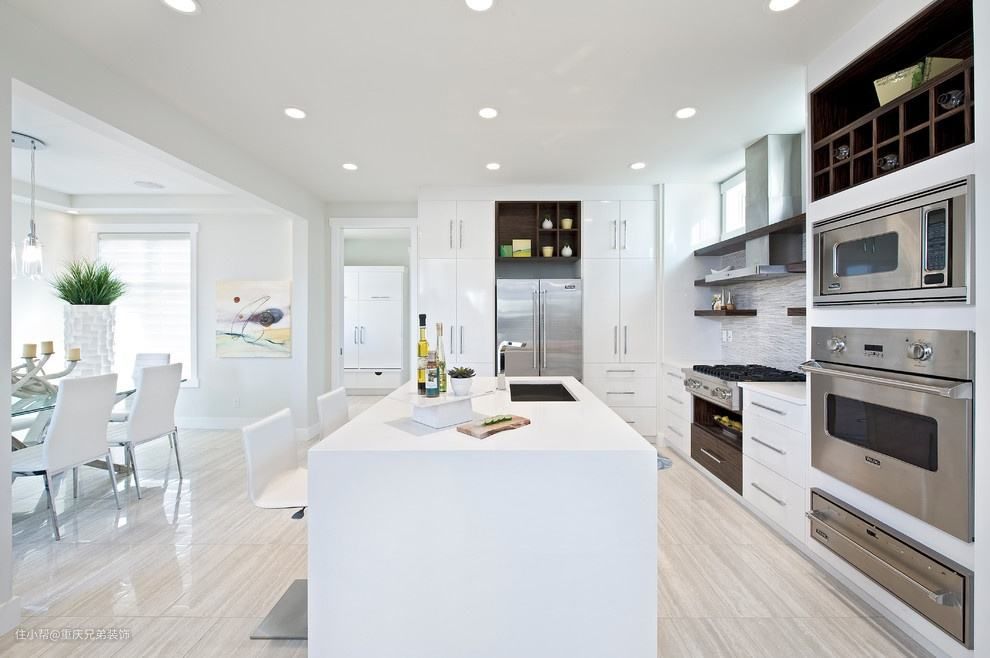 厨房家电非常多,放置家电最省空间的方式莫过于内嵌式,大概与操作台宽度一致,将上方的空间用作储物柜,空间看起来平整舒服,可收纳的空间也大。