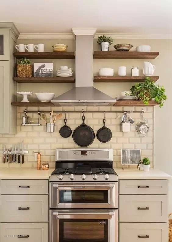 厨房东西多,搁板也可以用起来,放小东西和情景植被,挂钩可以解决洗碗布的放置问题,安一根不锈钢管,再买一些铁挂钩,可以把锅挂起来。