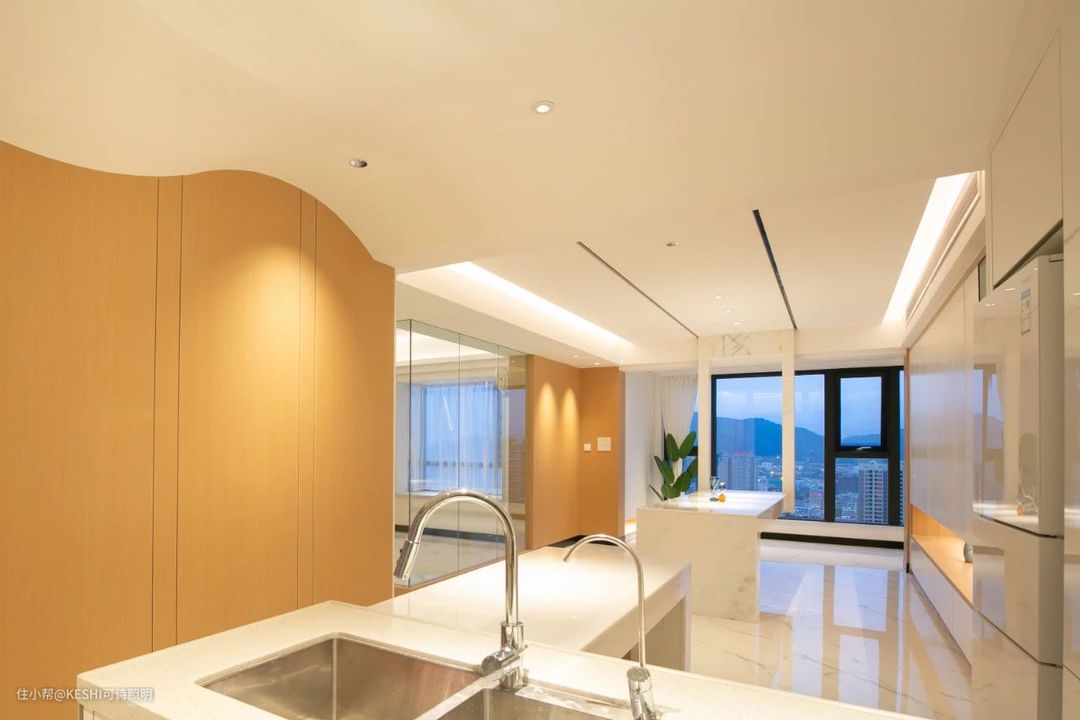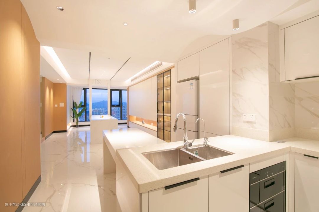 剔除一切繁琐的设计元素,用直白的灯光语言体现空间所营造的氛围,赋予空间以奢华和个性。打破常规沙发面对电视墙的格局,将客厅餐厅厨房做成开放式,增加岛台的设计,这样的厨房,可是大平层的标配。