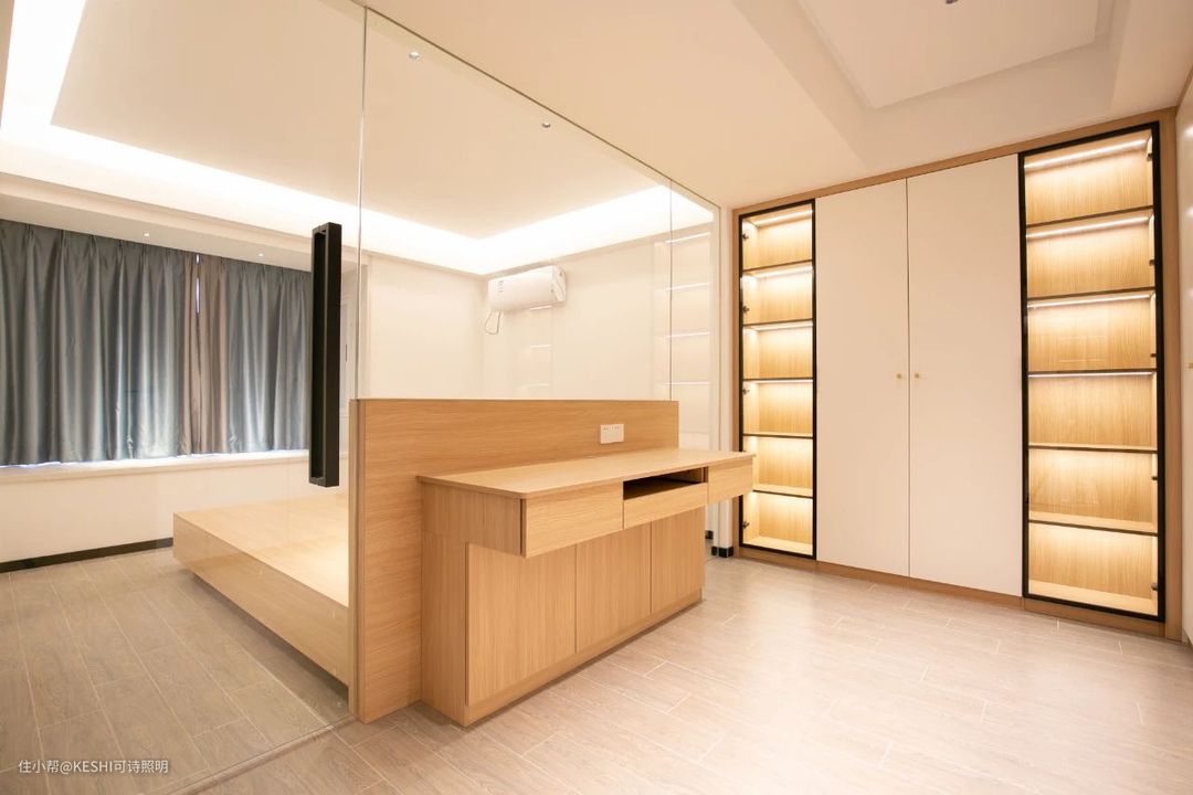 灯带无缝地暗藏在墙柜之间,柔和的光芒在四周散发,远远望去,像是编织了一个精美的密码,将业主的生活点滴全部收录起来,等待将来主人打开它,去解读自己的匆匆岁月。