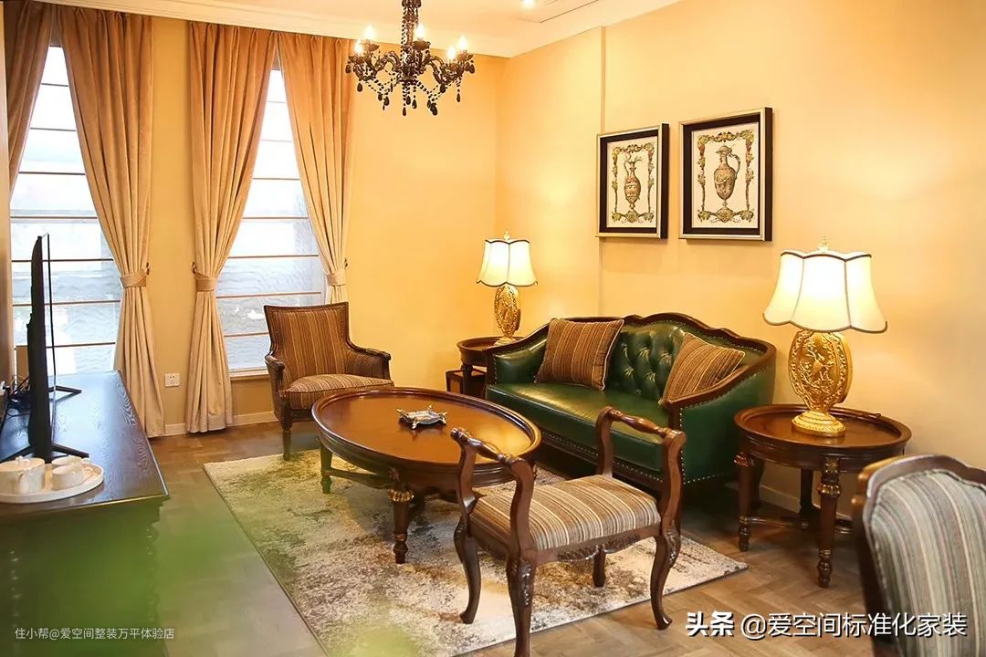 客厅家具以美式家居为主,大多为古典弯腿式,色彩比较偏复古一些,尤其是深绿色的沙发,让环境无意间增添了更多的优雅元素。