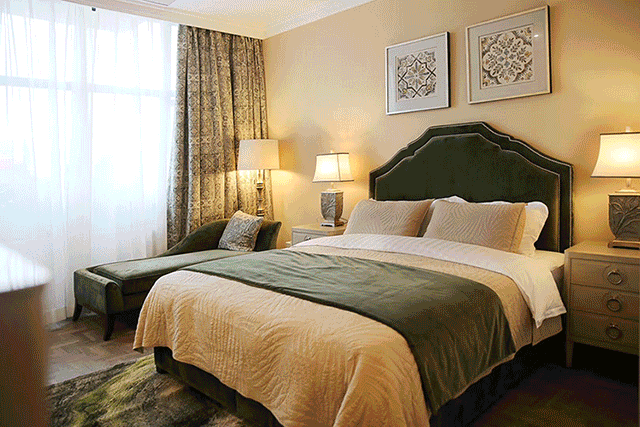 卧室里使用了墨绿色,暖暖的灯光,简洁的搭配,木雕花纹装饰的床,细节处理的很精致。一张靠背舒适的美式床铺,为旅客营造出华丽舒适的休息空间。