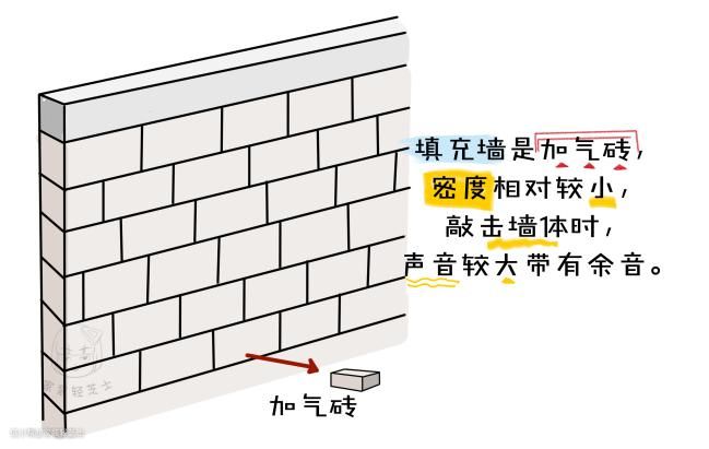 最常用的方法是听声音,因为承重墙通常使用实心砖,密度较大;填充墙是加气砖,密度相对较小;所以敲击墙体,听声音较小没有余音的,就能判断是承重墙。可以用于判断砌体结构或者剪力墙结构的房子。