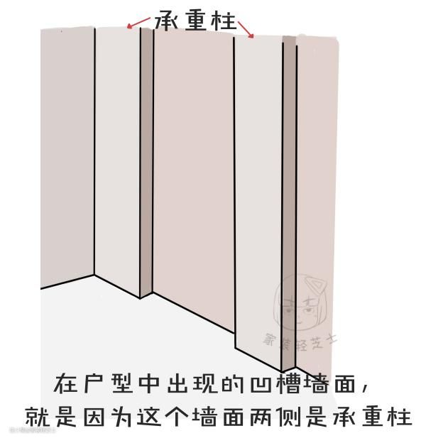如果墙角或者墙体中有立柱,那么这面墙很大几率就是承重柱,有时候我们户型中常出现的凹槽墙面,就是因为有承重柱才会产生,最常见于框架结构中。