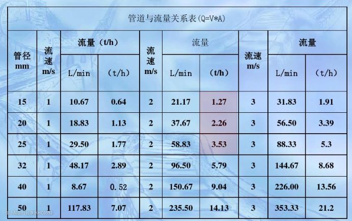 3.流量和流速的经验表格: