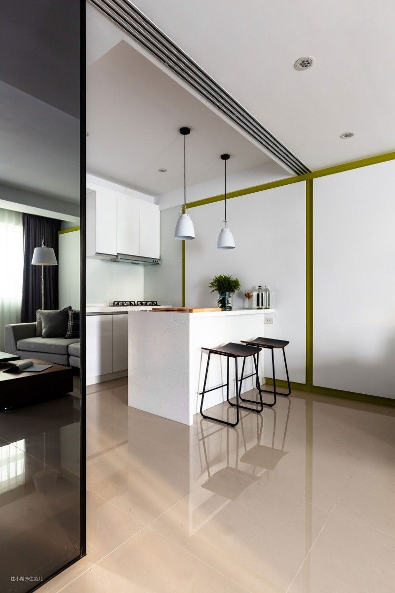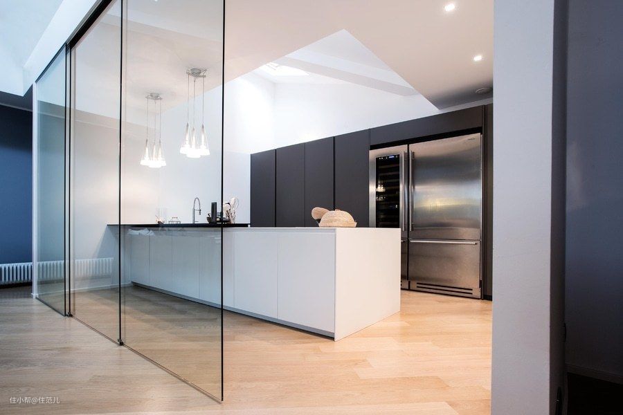 举个例子,下图的厨房,屋顶全部白色,橱柜用纯色平板门,地面是同一种木地板,推拉玻璃不要任何花纹。