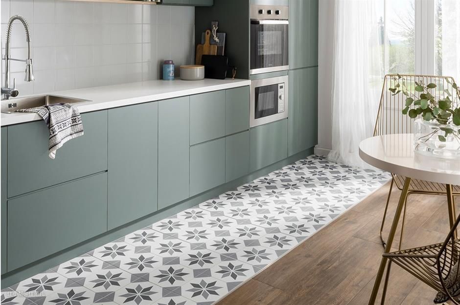 不要在厨房外铺木地板,厨房里铺木纹砖。