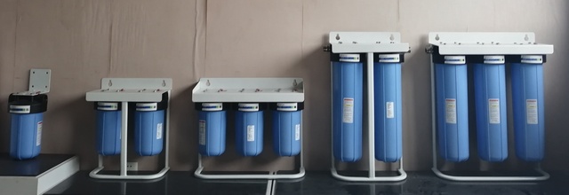 2.带旁通阀滤瓶(中间三个),有蓝色的和白色的两种,外观白色的,习惯上都称为大白瓶,带旁通阀的就是通过旋转控制阀手轮,控制水流方向,更换滤芯的时候不影响用水,带旁通滤瓶目前只能用挂片固定在墙上,或者直接放在地面,没办法用支架,但放地面后期更换滤芯会不太方便。