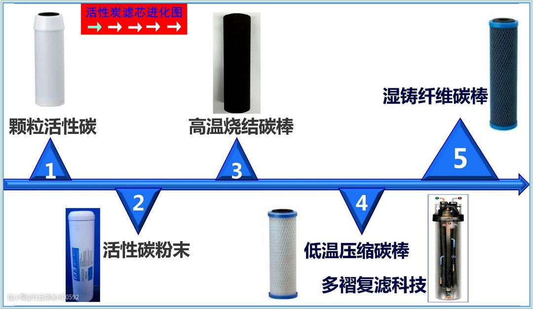 活性炭滤芯根据过滤精度可以分为25、10、5、0.5微米几种,CFB和FloPlus是活性炭纤维滤芯,是第五代产品,这两个是单纯的活性炭滤芯,过滤精度分别是5和0.5微米(这个0.5微米过滤精度太高,过滤效果虽然比较好,但是滤芯也容易堵),RFC和DFX是复合滤芯,过滤精度分别是25和10微米,既有PP棉也有活性炭的优点,虽说既有PP棉也有活性炭滤芯的优点,但又没有办法发挥出单独活性炭或PP棉滤芯的优点,主要适合于安装空间比较小的单滤瓶使用,或作为3道过滤的过度滤芯使用。