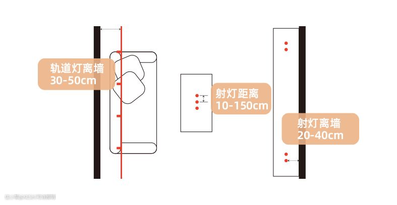 一般来说,射灯离墙20-40cm比较合适,轨道灯离墙面的距离在30-50cm为佳。光源与光源之间的距离建议10-150cm之间,这个范围变化较大,主要是看光束角度、空间格局与实际场景的光照需求。