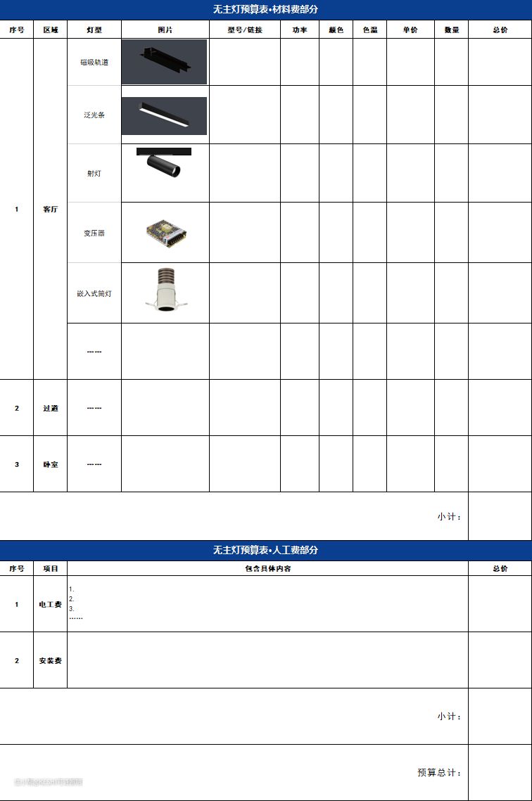 无主灯涉及较多光源和配件,造价相对较高,一般客厅光配置光源就需要3000-8000元。为了不出现错漏项、合理控制整体预算,建议先做好预算表。列清楚每个空间所需项目,以客厅空间为例: