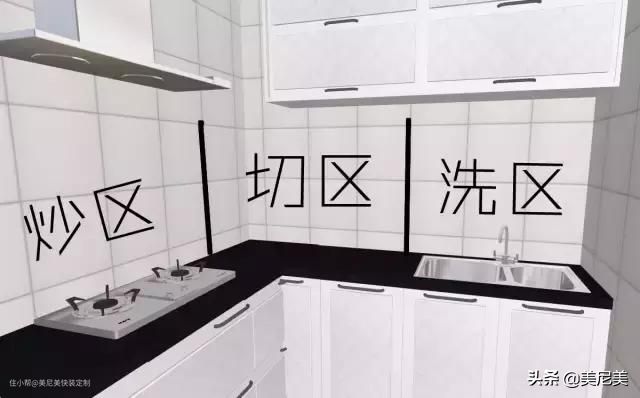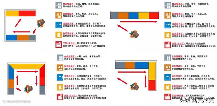 厨房的基本动作是顺时针或逆时针依次清洗蔬菜(水槽)→切蔬菜(台面)→炒菜(炉灶)。