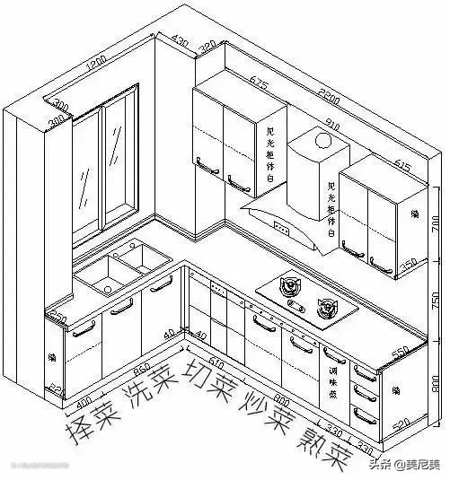 这样,所有的功能需求都在厨房里完成,非常节省时间。具体尺寸如下:水槽区:800毫米;切菜区:600毫米;烹饪区:900毫米;其他区域:400毫米;台面深度:520毫米~ 650毫米;吊柜深度:320~350mm。