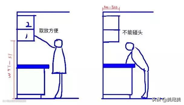 吊柜的高度由地柜的高度、地柜的深度和业主的高度决定。通常,设计时应至少满足两个条件:一般来说,吊柜的深度是300-350毫米,距离灶台面700毫米高。橱柜的高度离地面约850毫米,这由灶台的高度决定。地柜一般有隔断式和抽屉式,比抽屉式更方便。