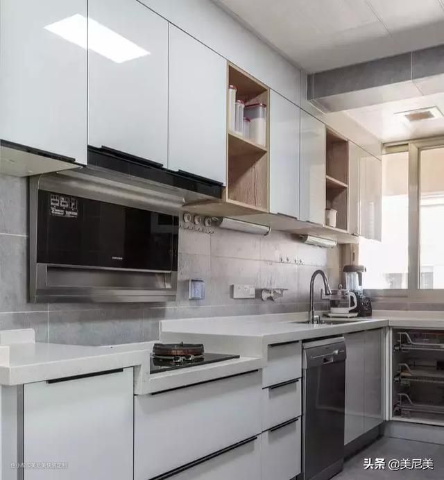 L型布局:L形布局充分利用了橱柜角落的死角。最常见的做法是在厨房的两个相邻的墙上摆放橱柜。然而,角落区域的使用是有限的,并且很容易感到堵塞。