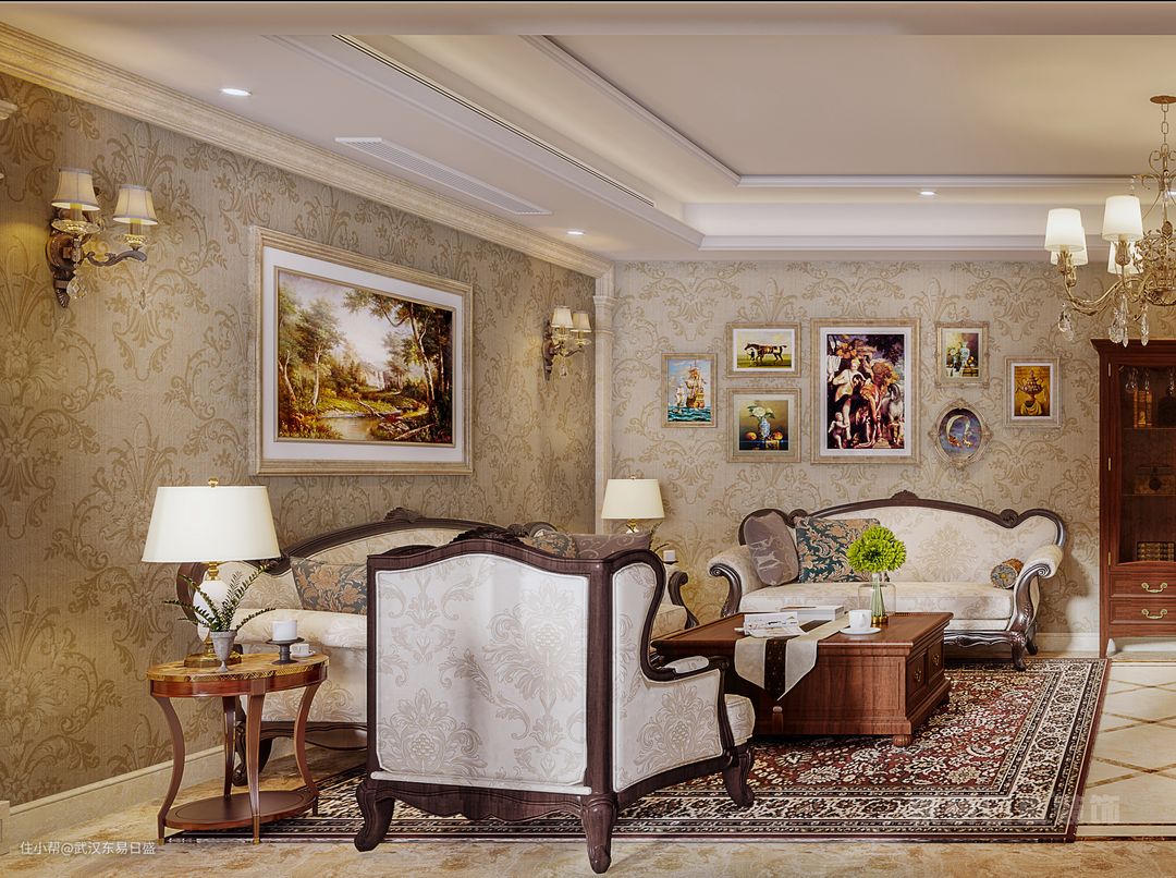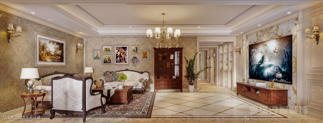 客厅采用内嵌式石膏吊顶,搭配精致的水晶吊灯,营造出一种怀旧、浪漫的感觉。在沙发区铺上大幅花纹地毯,不动声色地划分空间区域。