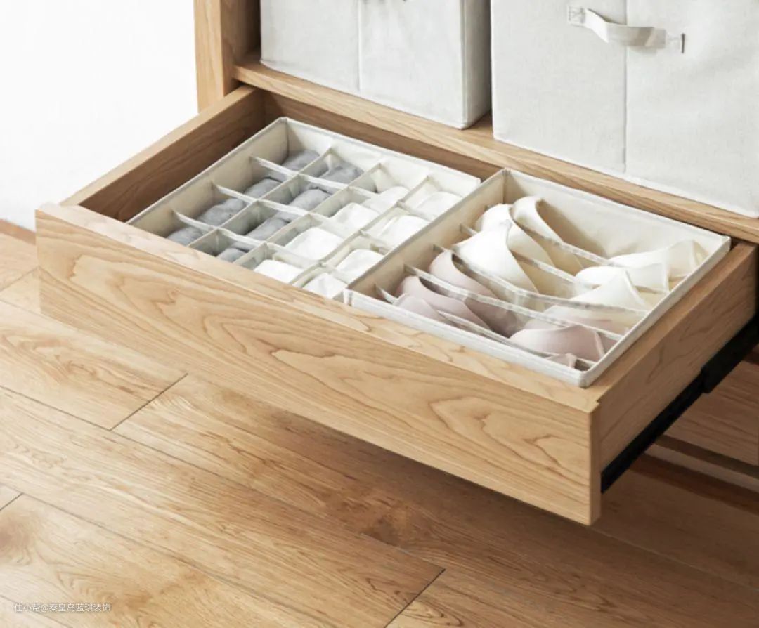 比较小的衣物如袜子、长筒袜、内衣内裤,很容易变得乱糟糟,可以选择多格分隔收纳盒,每一个小衣物都被整理得井井有条。