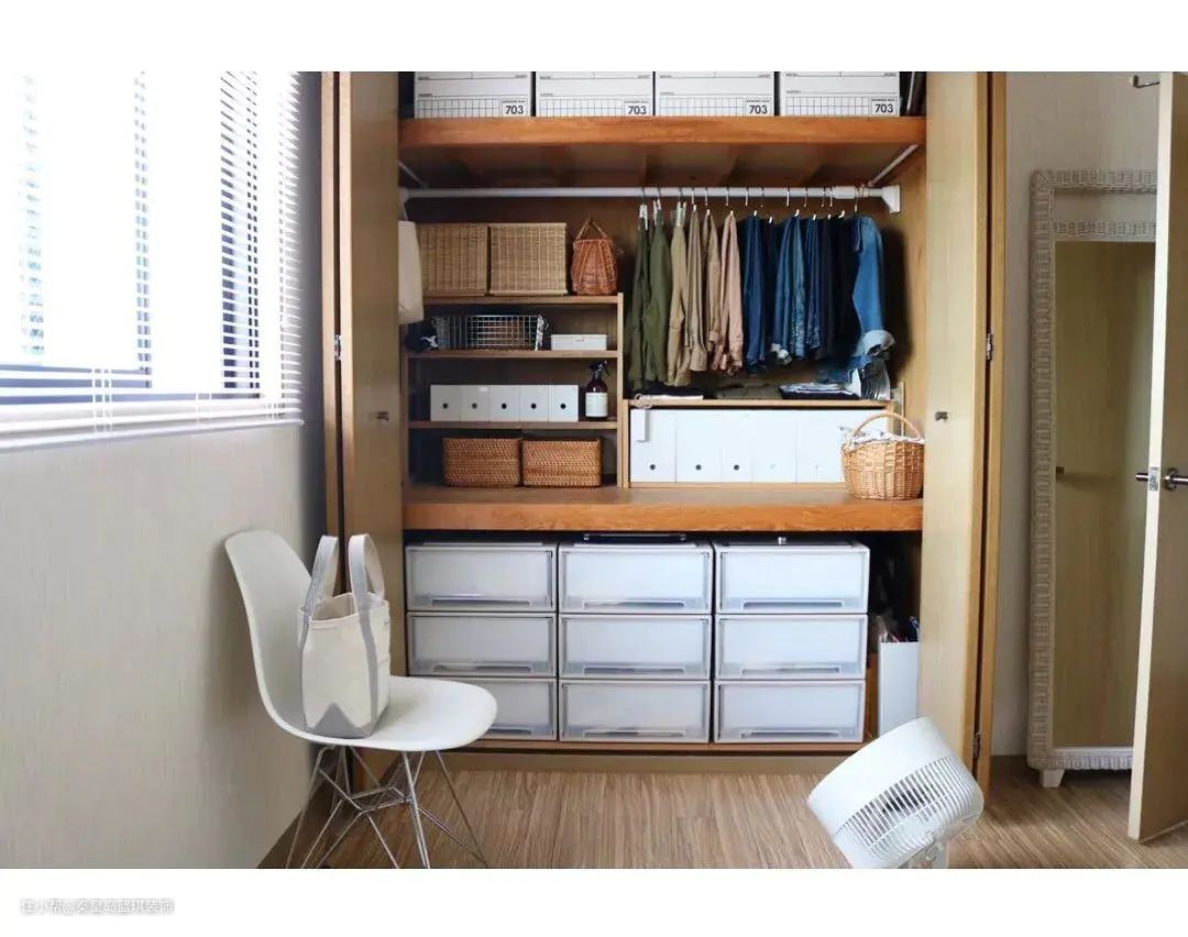 Tips: 衣柜每天开上开下会有许多灰尘进入,所以不常用的物品最好用有盖的收纳盒或带拉链的收纳袋来收纳;床品可以用真空压缩袋压缩,以节省空间