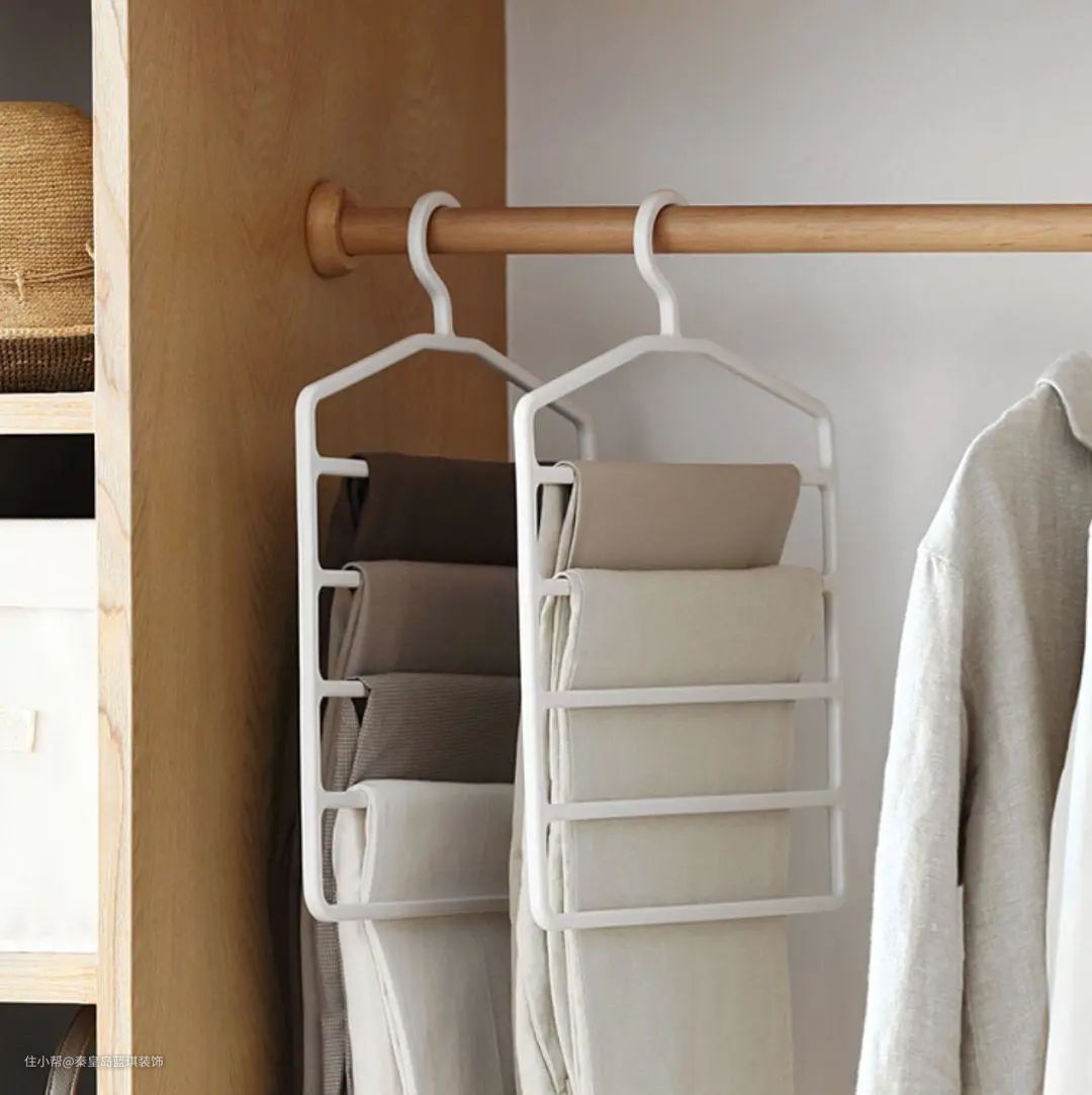 如果你刚好是标准的都市懒人一枚,最佳的解决方法就是「能挂就不叠」。按照衣服的长度、颜色深浅依次排列挂好。裤子可以选择这种多层裤架,同时收纳几条裤子,节省空间。