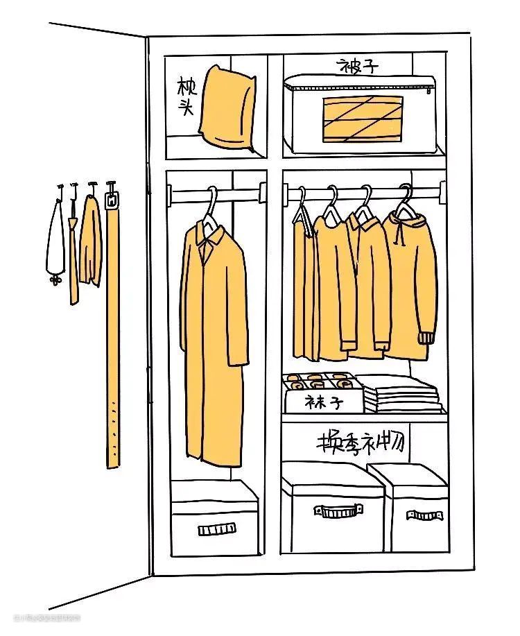 首先,你要对衣柜进行宏观规划,明确各个区域的作用,才能保证每次都能物归原处。一般是这样对衣柜里的物品进行规划的: