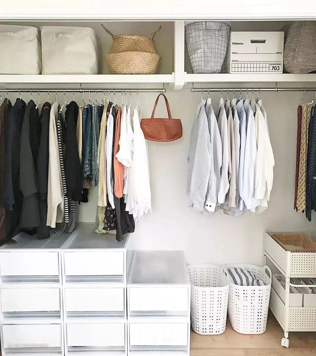 衣服的收纳要按类型区分,用不同的方法才能达到空间利用和存取便利的最大化,尤其是大部分一根杆子撑起一个衣柜的那种,更要善于用不同的收纳盒来实现衣服的分类收纳。
