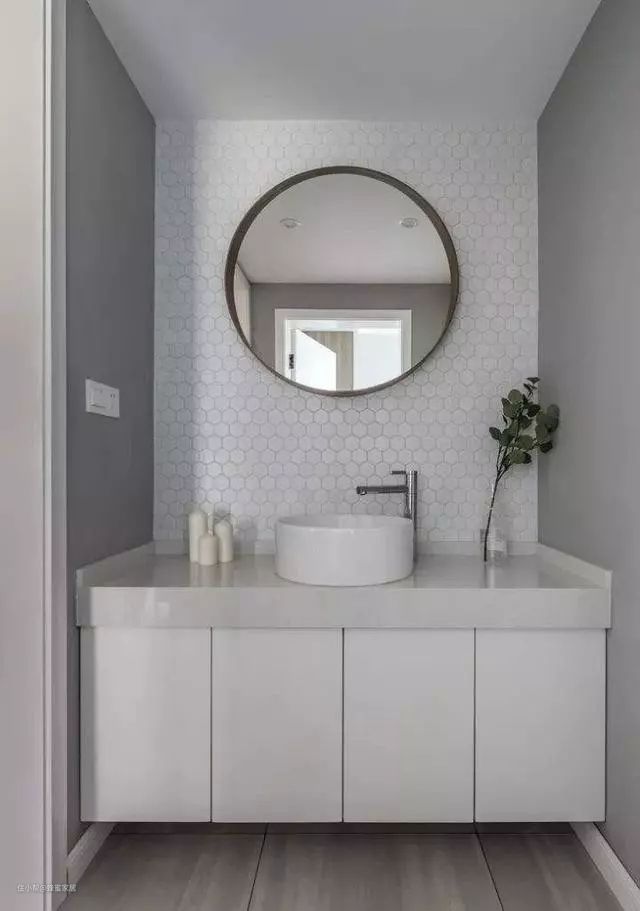 5.预留位置:浴室镜柜旁,提前预留插座,现在厕所大多是干湿分区的装修,为了方便使用,一些小型家电:剃须刀、吹风机等都收纳到浴室镜柜后,所以在镜柜旁预留一个插座,方便使用。