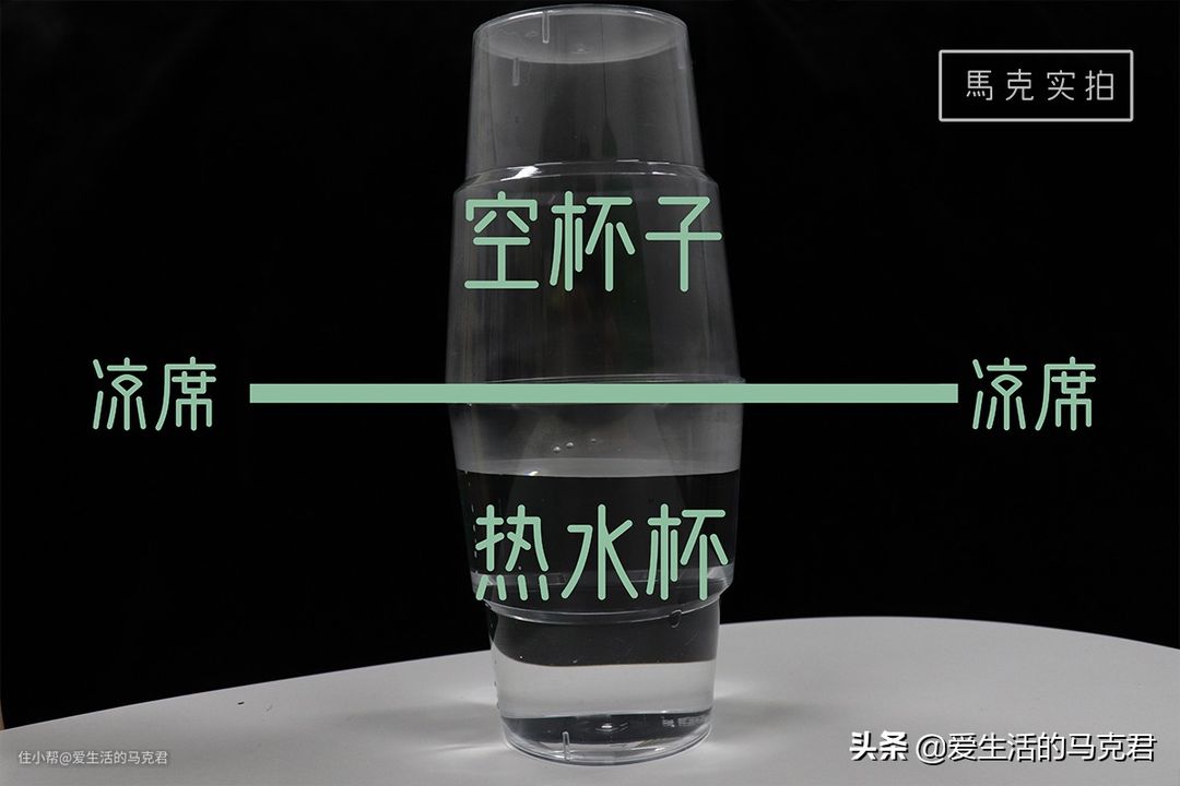 我将杯中装入等量等温的热水,盖上凉席,再再凉席上盖一个空杯子并压紧。