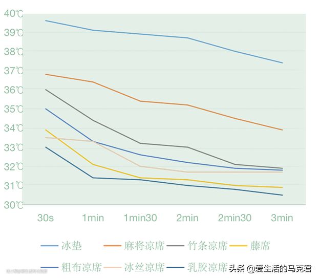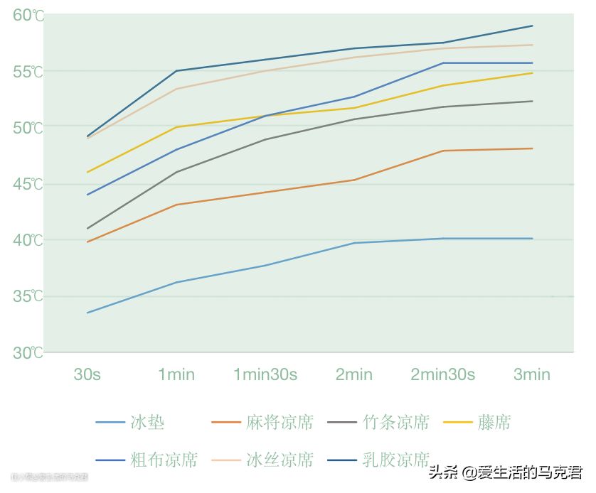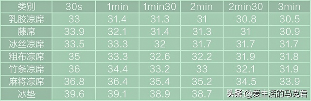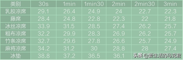 每30秒记录一次凉席表面的温度,测试时间为三分钟。(图表单位为摄氏度)
