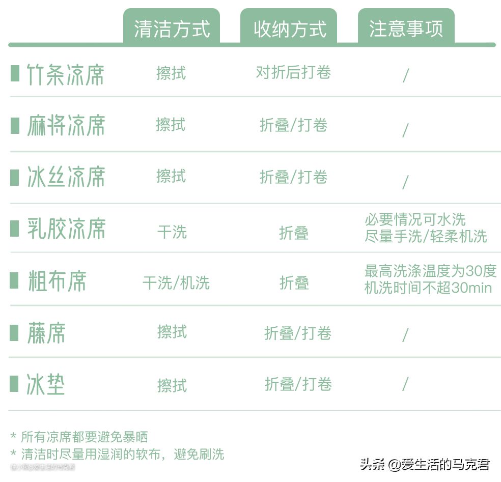 大家都知道传统的凉席进行收纳和清洁时还是比较麻烦的,所以这部分就来总结一下各类凉席在清洁和收纳上的方式及注意事项(仅为粗略类型概括,具体清洁收纳方式因产品而异)。