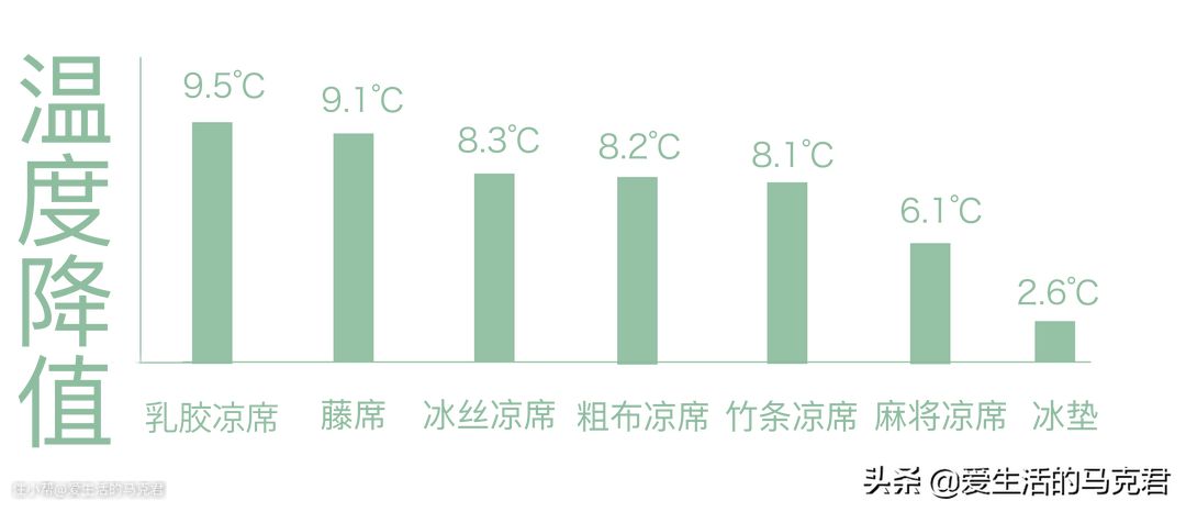 由图表可见,冰垫在空调间比在室内多降温了10℃,竹条凉席降了9.6℃,藤席降了9.1℃,乳胶凉席降了8.2℃,其余的都在6℃左右。