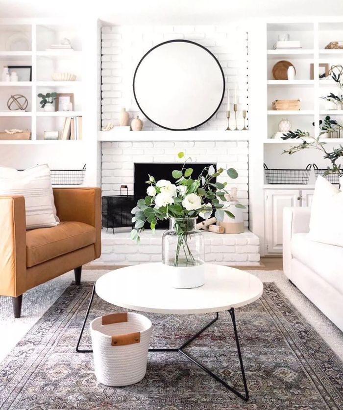 尽管方形镜子是浴室中最常见款式,但圆形镜子天生自带的网红装饰感,可以悬挂在客厅的背景墙上,带来赏心悦目的美感。