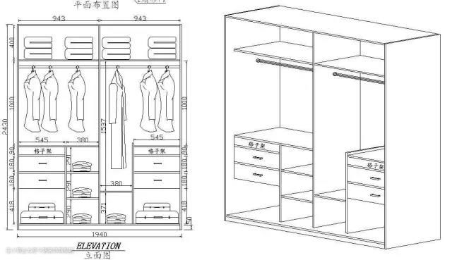 从图中我们可以看出,一个布局合理的衣柜内部格局一定是:1.隔板少 ;2.抽屉多;3.挂衣服的地方要多;4、有弹性空间。