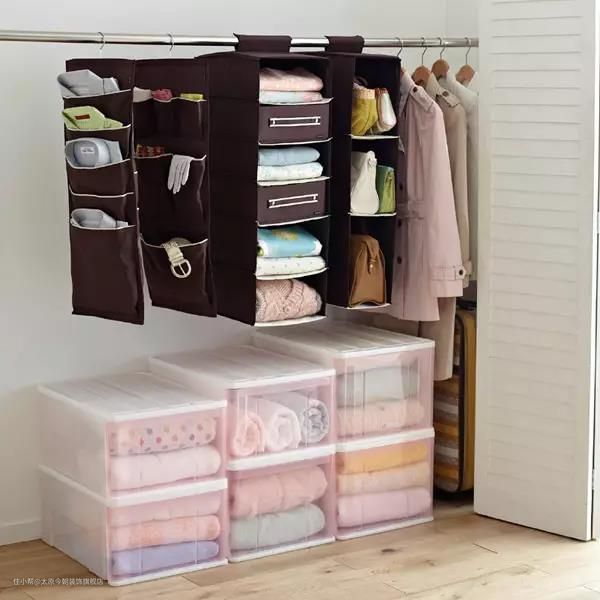 上面可以用来挂冬天的短衣,这样一来其实还会有一些多余的空间,可以放几个成品塑料抽屉,用来收纳围巾这些小配件。