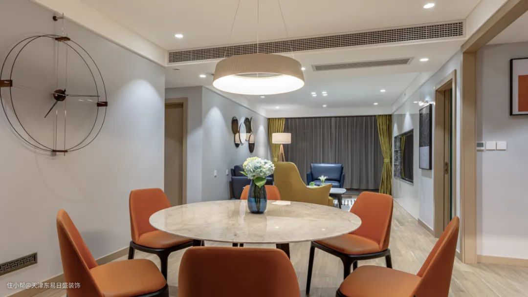 浅灰色的墙面,白色大理石餐桌,爱马仕橙色餐椅,冷暖色的混合立显一种高级感。