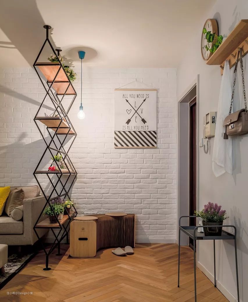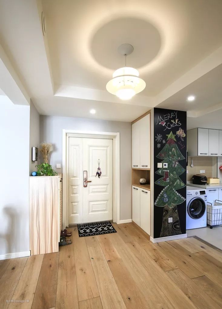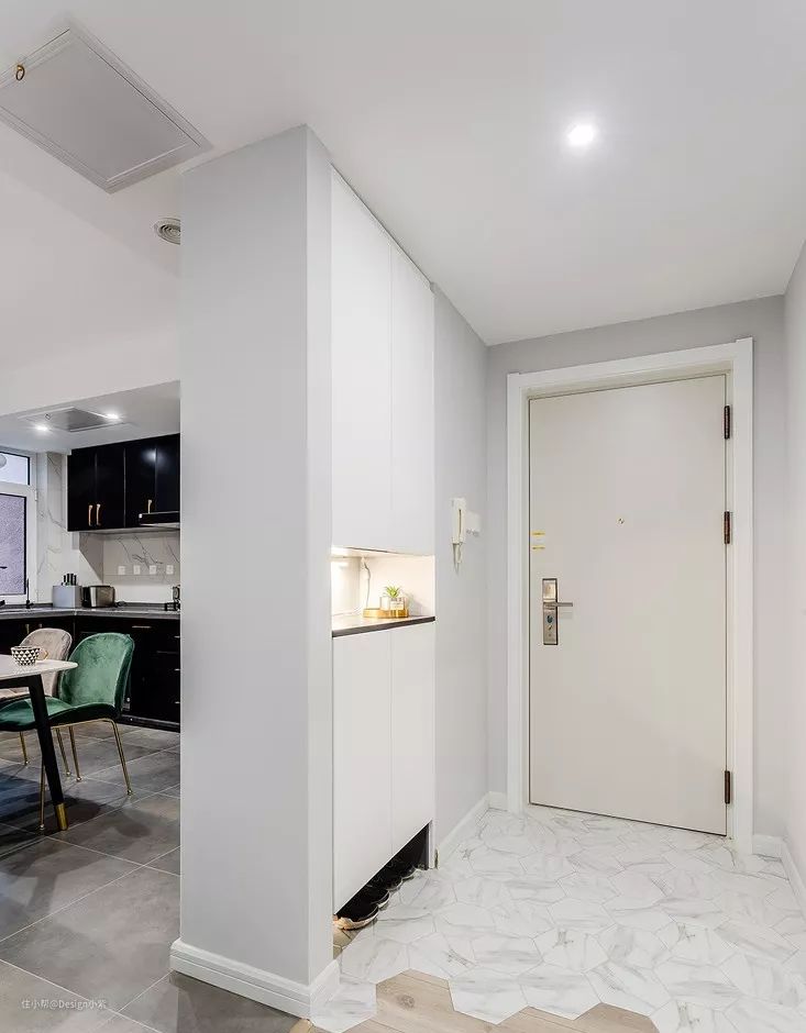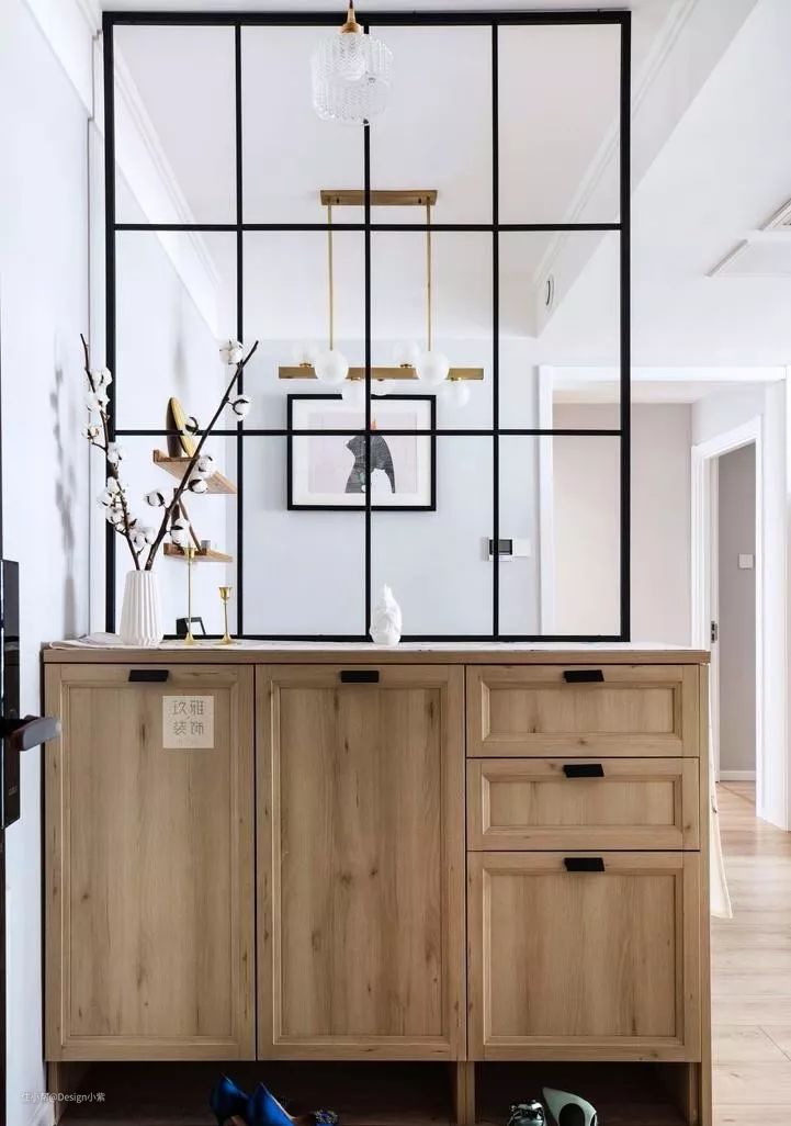 这种情况比较简单,直接靠墙做一个玄关柜就好。最好是顶天立地的大柜子,颜值高,收纳能力强。