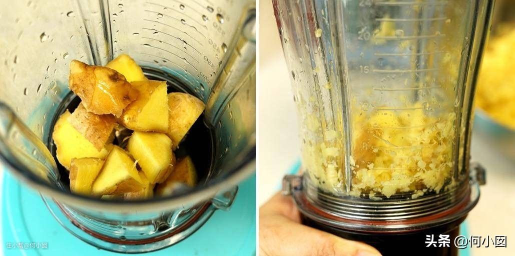 也是经常会用到的功能,多炒几个菜,或者熬姜汤,烘焙里面做姜汁撞奶,都会用到,手切太慢了,用破壁机,低速10秒钟吧,就搞定了,非常方便,首先因为两个杯子大小差很多,姜切同样的大颗粒,其实不切这么小也可以的,只是因为小V底太小,如果姜太大会大部分空转,所以我切成了颗粒,如果是小B就没这样的担忧,姜切这个两倍大就可以完成了,因为杯子大小的差异,我同比例的,小B使用了300g左右的颗粒姜,小V使用了100g左右
