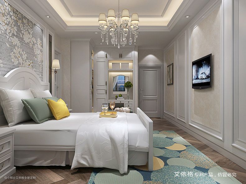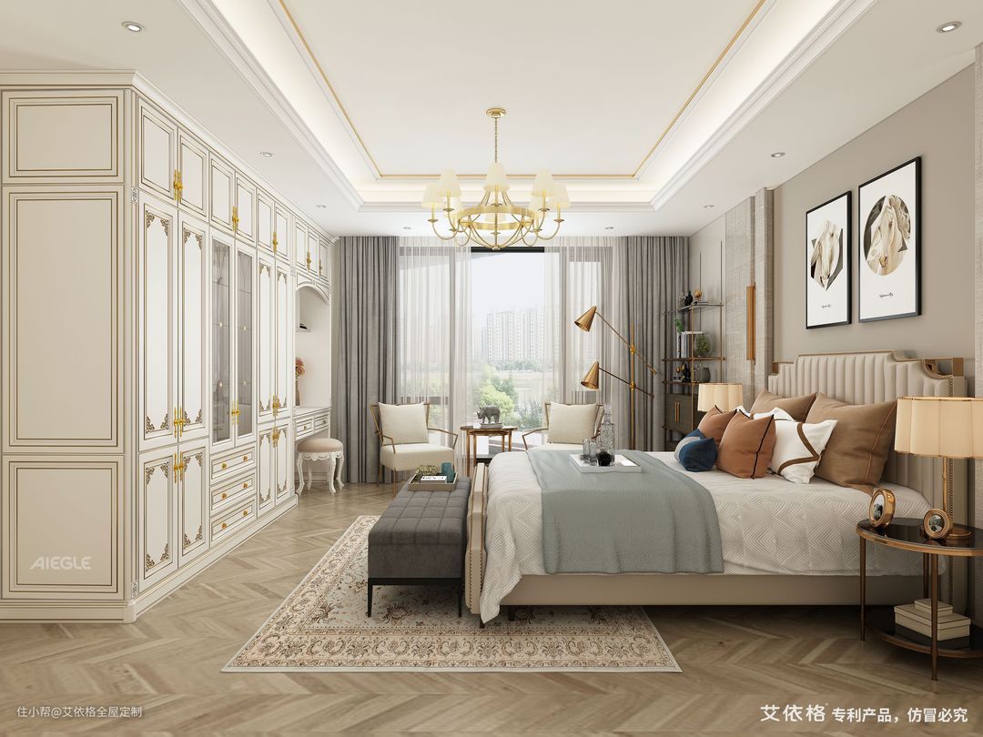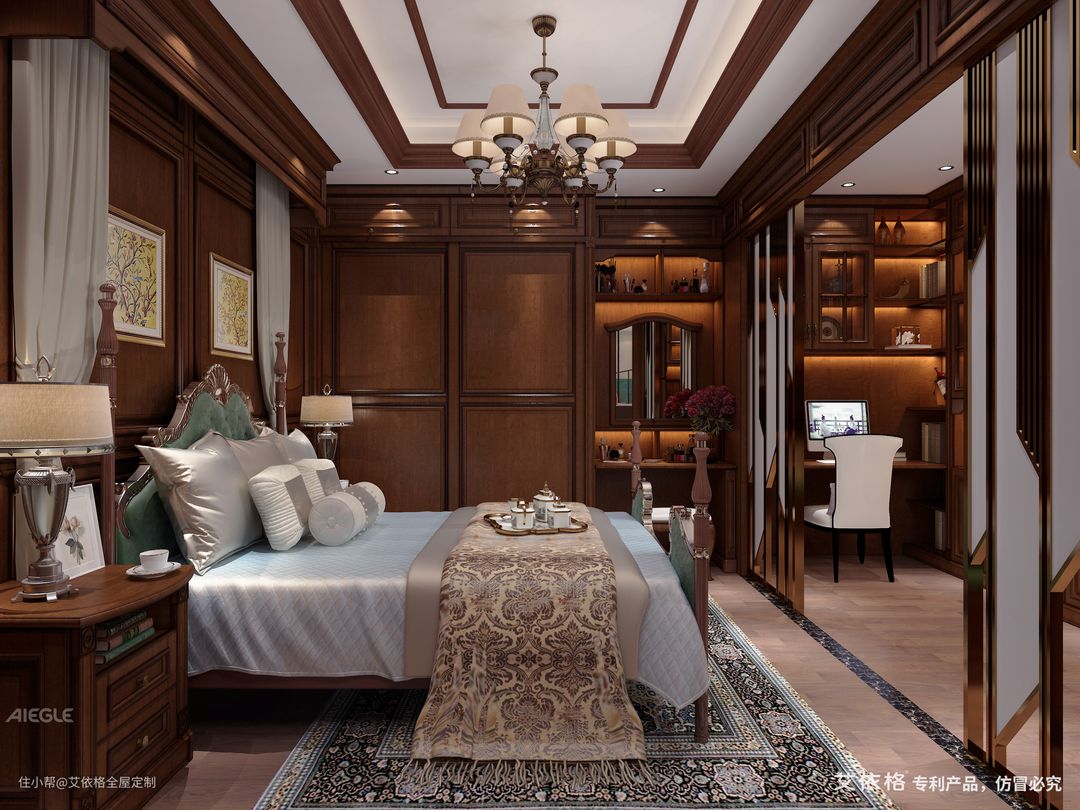 美式红樱桃推拉门衣柜+梳妆台,成为卧室的主要装饰与收纳担当,镜子下方空间收纳瓶瓶罐罐,再也不会乱成“杂物堆”,房间的格调沉稳而深厚,以淡雅色的软装衬托,彰显屋主的高品位与尊贵。