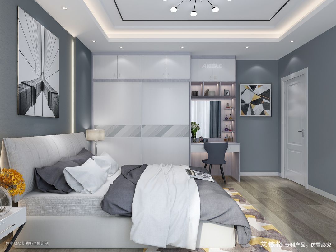 蓝白色通顶衣柜,斜纹鲁白腰线,赋予空间动态美,精美带抽屉梳妆台,简洁大方,再摆上一束玫瑰花,亲近自然,让人心旷神怡。