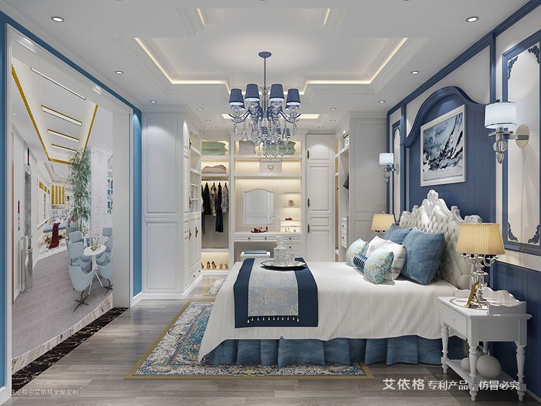 白色家具和蓝色背景墙搭配,轻轻淡淡地走向纯净、优雅的高颜值空间。坐在精美梳妆台的方正凳子上,对着弧形镜子,舒心喷香水、画眉、系丝带,简直太美好了!