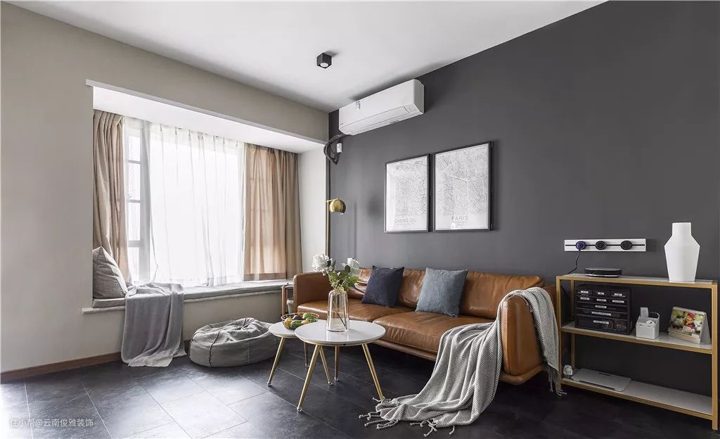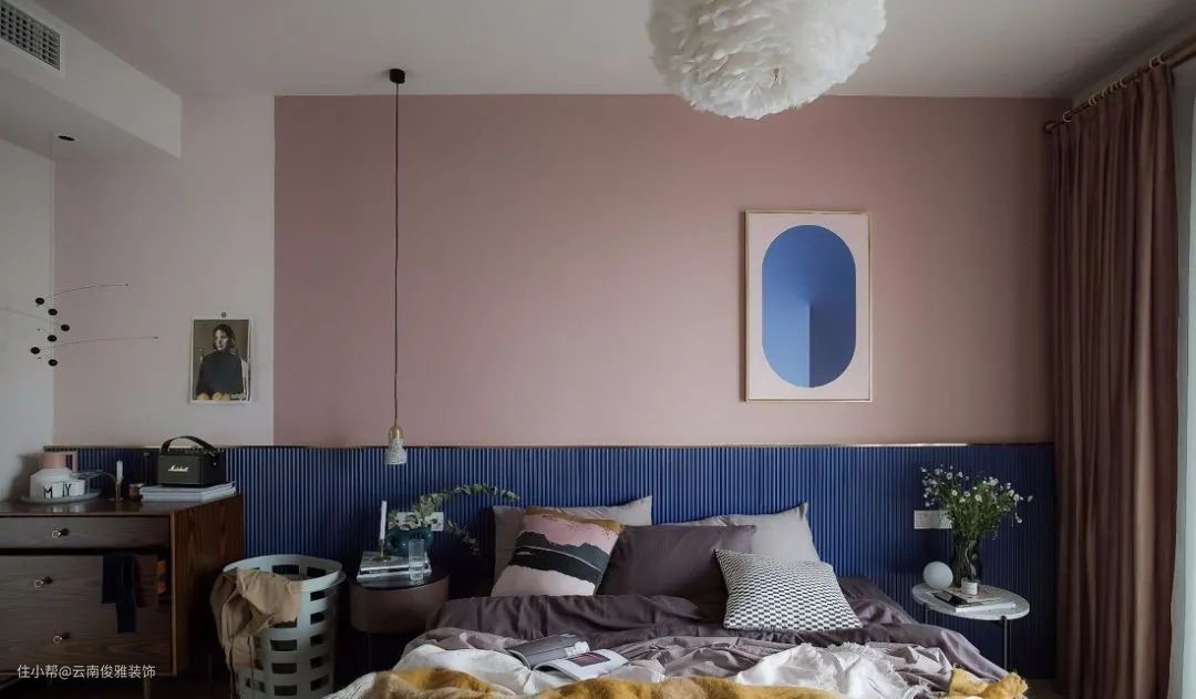 或者找个靠谱的设计师尝试勇敢的撞色,深色和亮色用好了会很出彩,但软装搭配难度也会比较大。划重点:设计师一定要靠谱!协调的半墙双拼色能让整个空间转变格调,文艺清新又更加彰显个性。