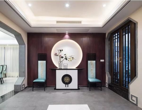 中国古代风水专著《青囊序》曰:“一生二兮二生三,三生万物是玄关。”玄关墙搭配圆的造型,象征了圆圆满满,能够给家庭带来清正之气。