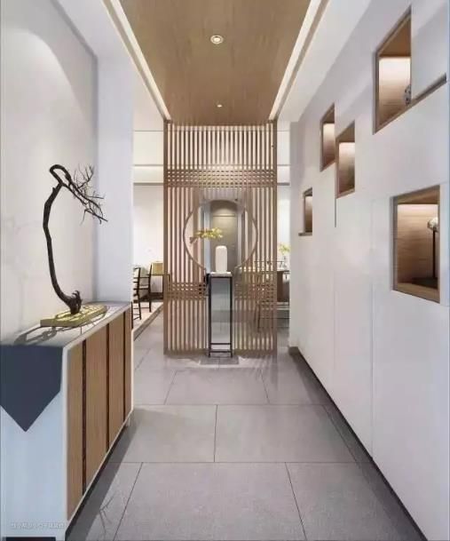 如果是入门后空间较窄小的户型,将玄关墙面设计为通透的、半遮半掩的设计形式,不仅避免了“一览无余”的尴尬,而且也能带给人一种朦胧的层次感。