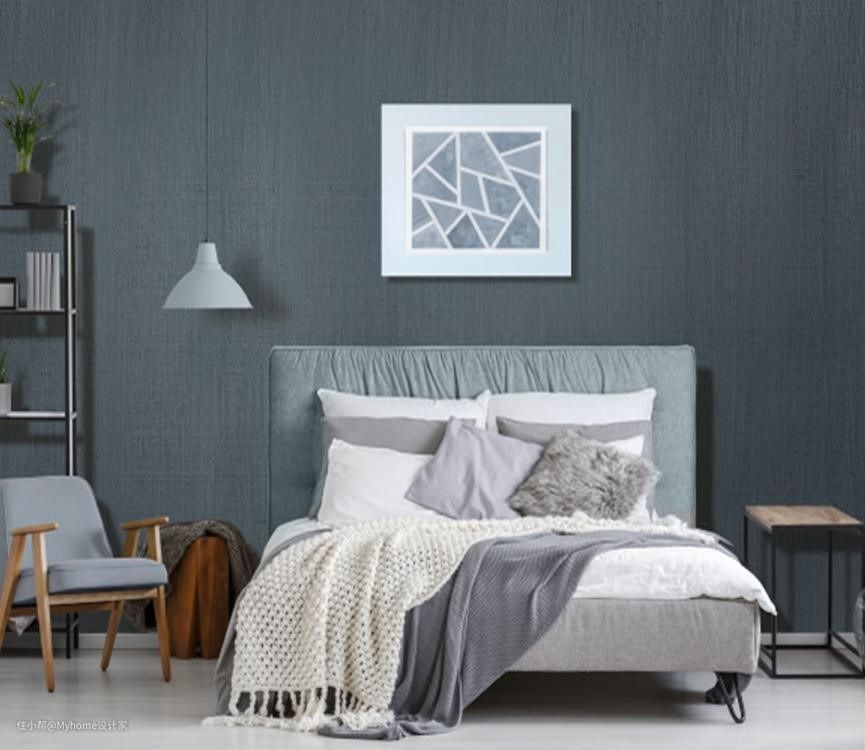 烟波ZMQ-N007,刷二遍漆,搭配青色皮床,优雅的单人椅、白色床头吊灯、灰色床品,简单的空间因为有了立邦艺术漆的加入,墙面特殊纹理质感给整个卧室营造出温暖舒适感。
