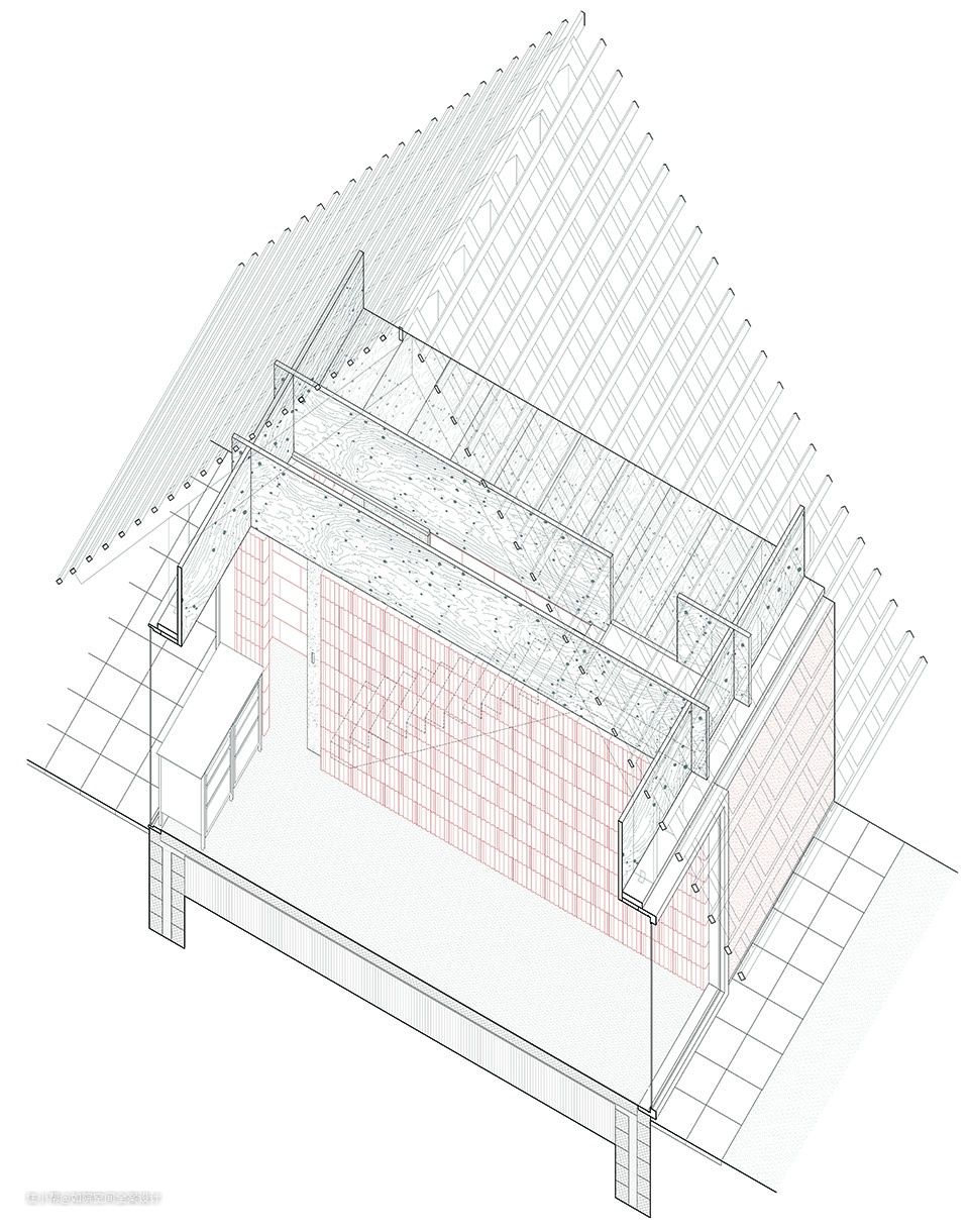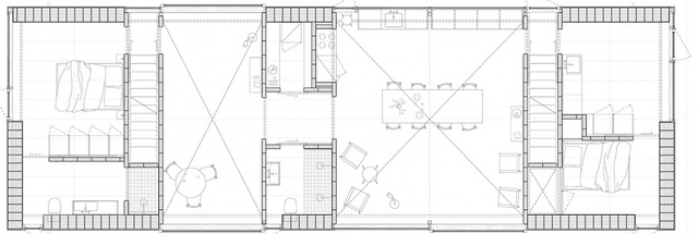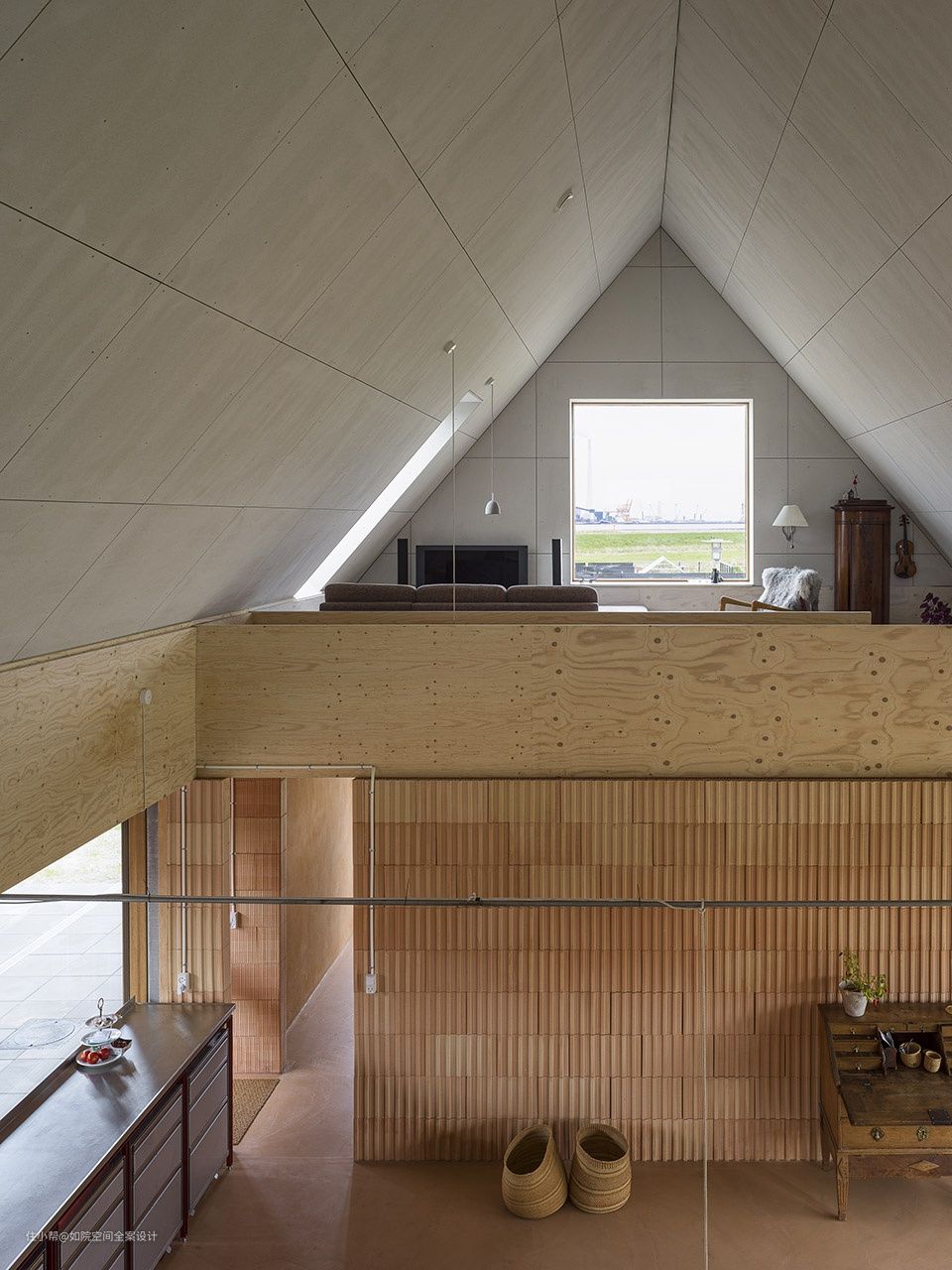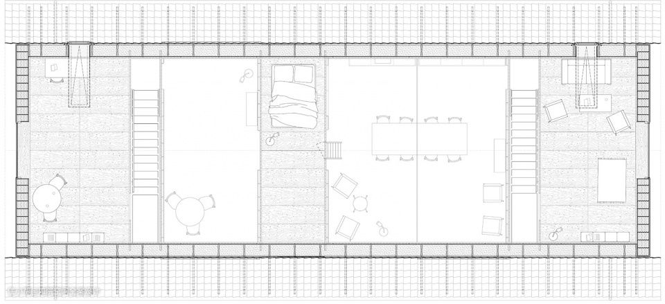 空间布局围绕三个体量安排,通过分区分隔,建筑稳定,围合楼梯允许移动到上层夹层,其中容纳了办公室和额外的睡眠空间。