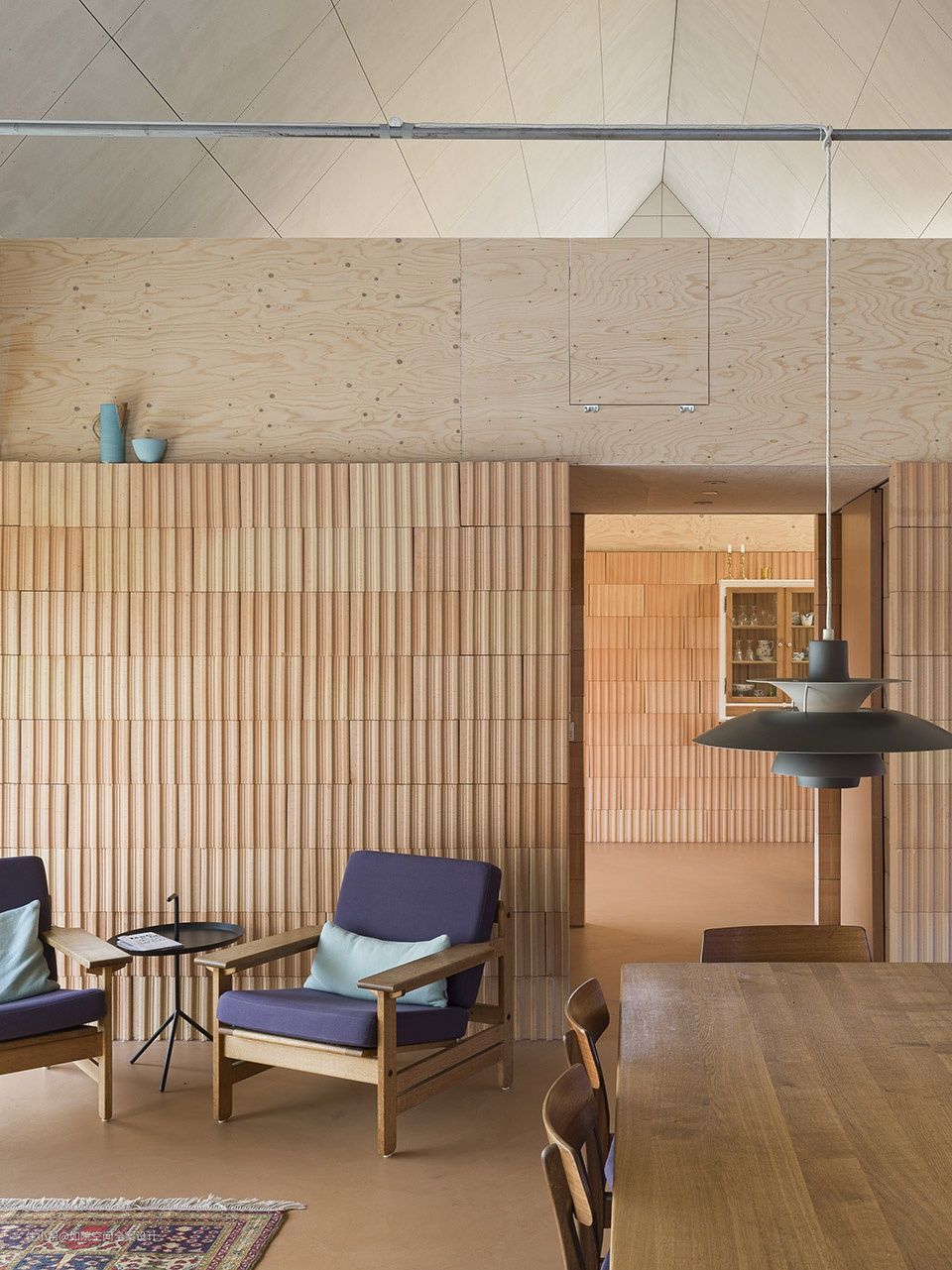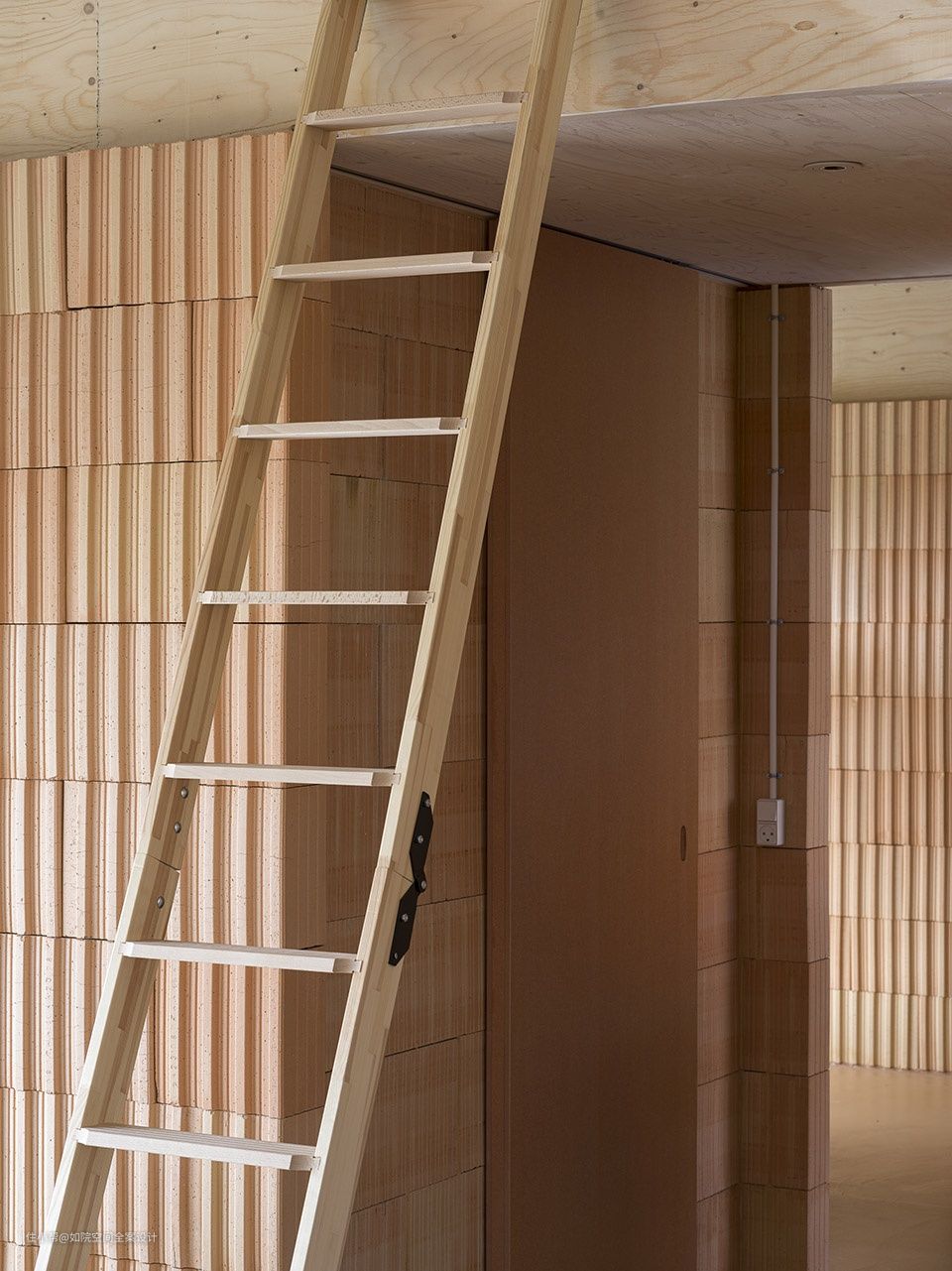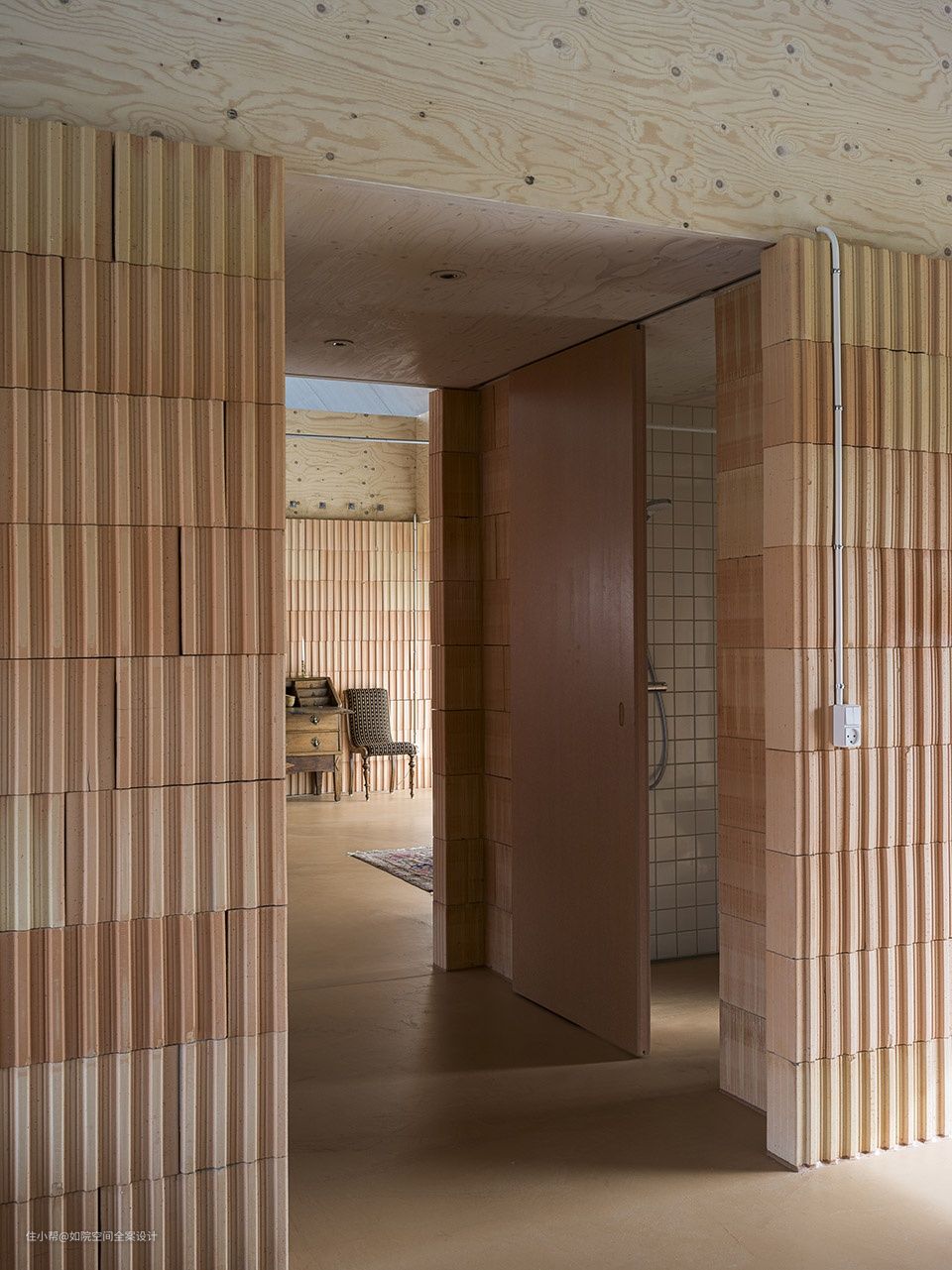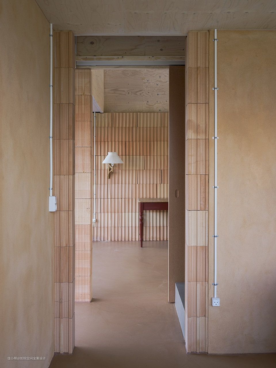层压单板木材,粗渲染,绝缘粘土块,彩色中密度纤维板,纤维石膏板,粉末涂层钢,皂云杉胶合板和沙色水泥砂浆给内部一个丰富多彩的材料质量。