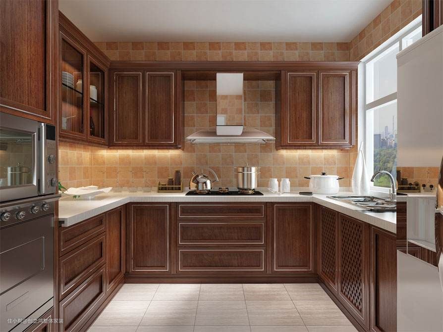 实木整体橱柜比较适合偏爱纯木质地的中年消费者高档装修使用。实木制作的橱柜门板,具有回归天然、返璞归真的效果,风格多为古典型,其门框为实木,以樱桃木色、胡桃木色、橡木色为主,门芯为中密度板贴实木皮,这样可以保证明木的特殊视觉效果,而且边框与芯板组合又可以保证门板强度,且不开裂、不变形历久长新。