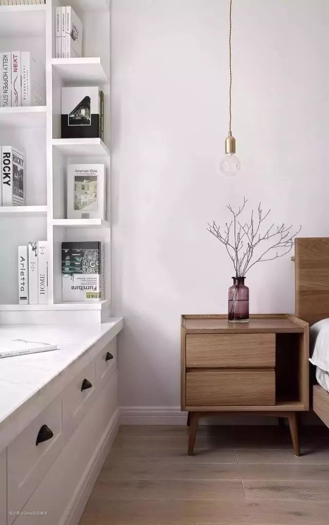 利用书桌来代替床头柜,再把书桌延伸到飘窗上, 再也不担心书籍、电脑和零碎杂物摆放不下了。