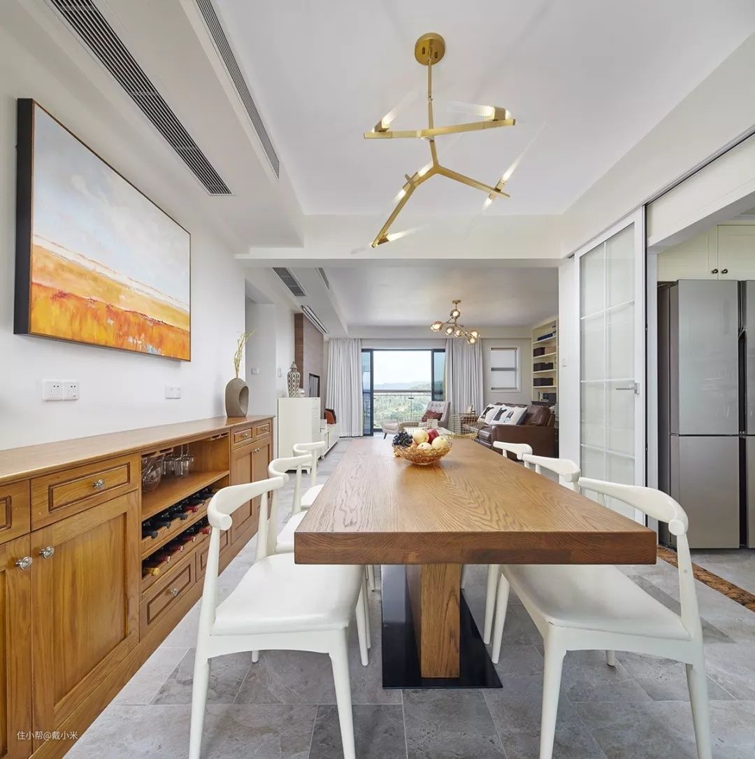 吊灯的高度,比平时装的要低很多,这样才会让餐厅的氛围更好。另外除了吊灯之外,还可以通过筒灯射灯来辅助照明,这样可以适合更多模式,比如聚餐人多的时候就适合明亮的灯光。